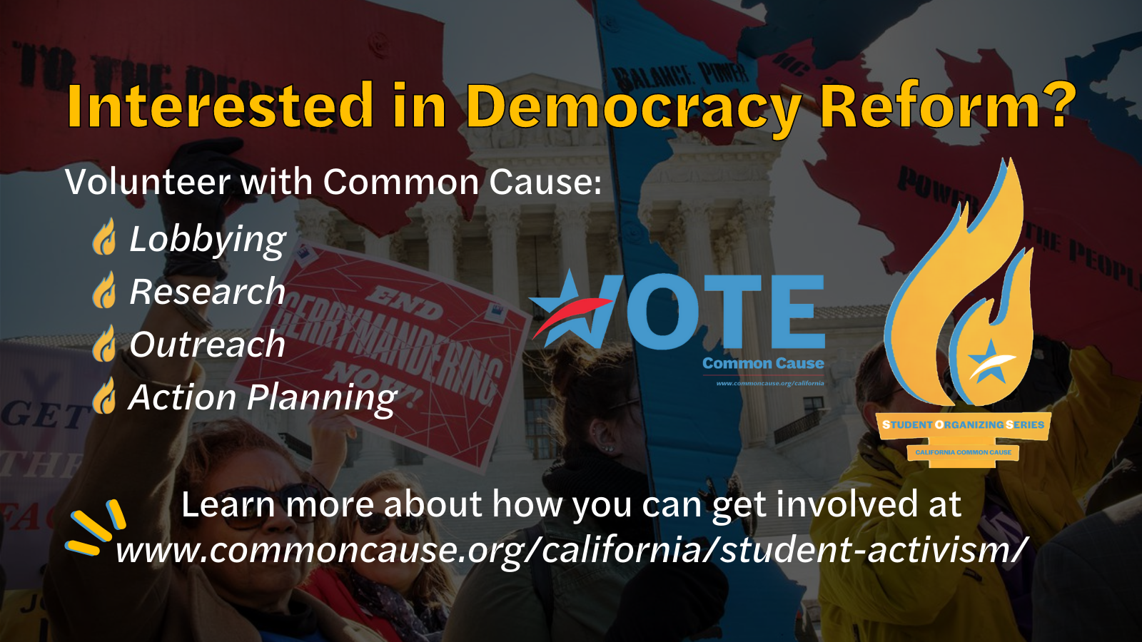 Interested in lobbying, outreach, action planning, or reform research? Contact Alvin Valverde Meneses for more information on volunteering with California Common Cause.