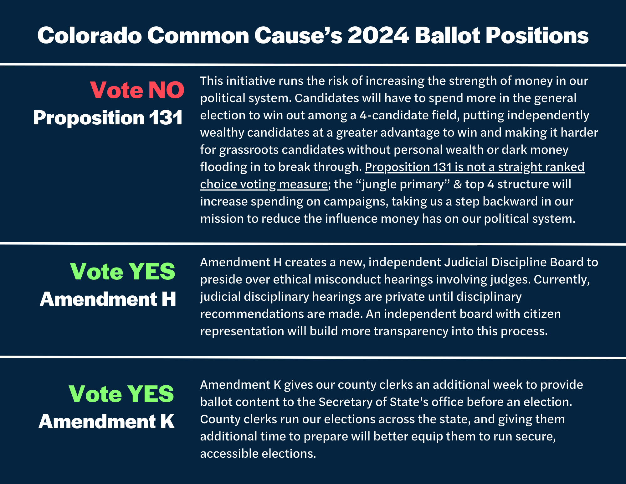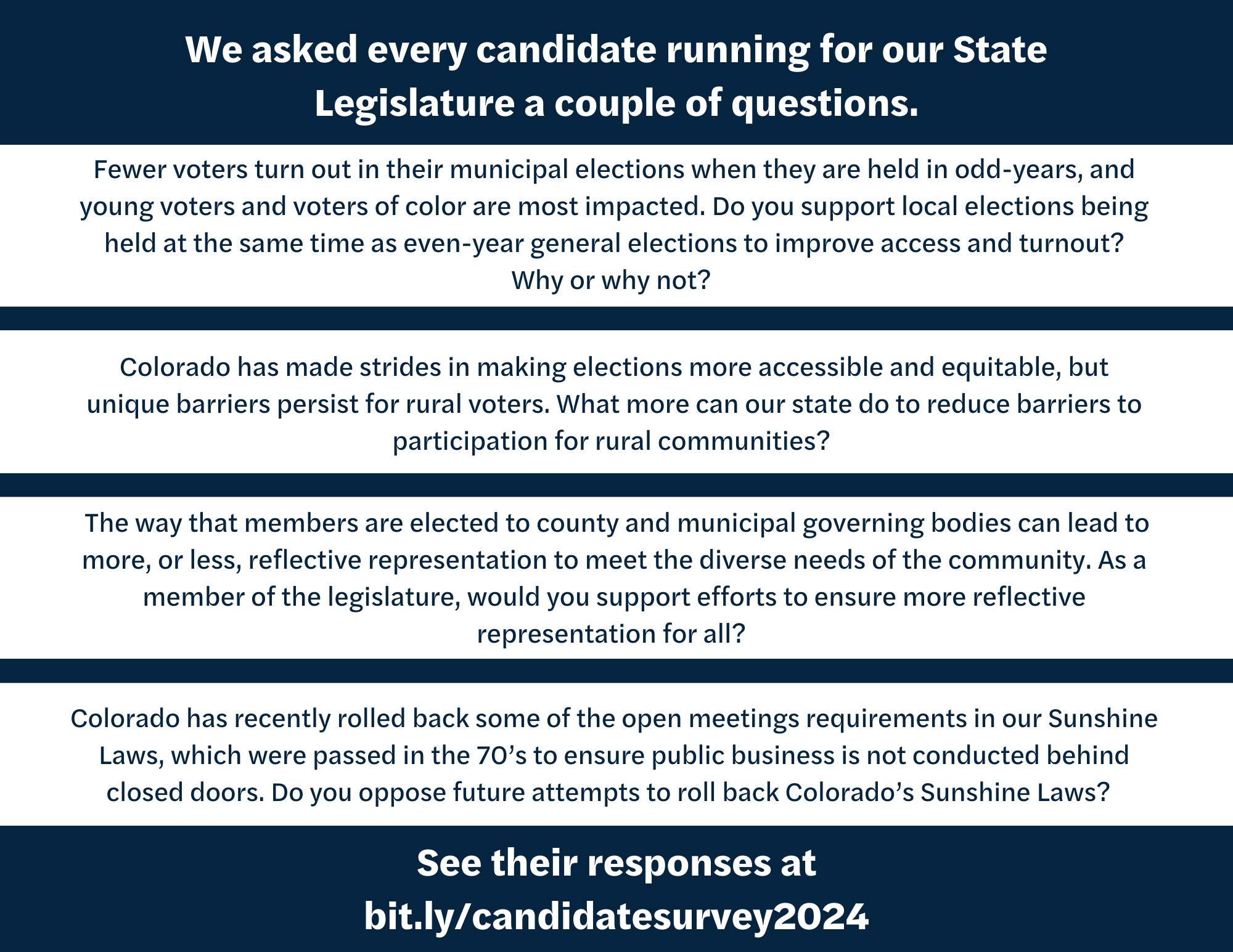 Die Empfehlungen von Colorado Common Cause zu drei landesweiten und drei lokalen Abstimmungsvorlagen finden Sie in unserem Wahlleitfaden 2024. Wir haben außerdem alle Kandidaten für die Staatslegislative nach ihren Positionen zu mehreren kritischen Demokratiefragen gefragt.