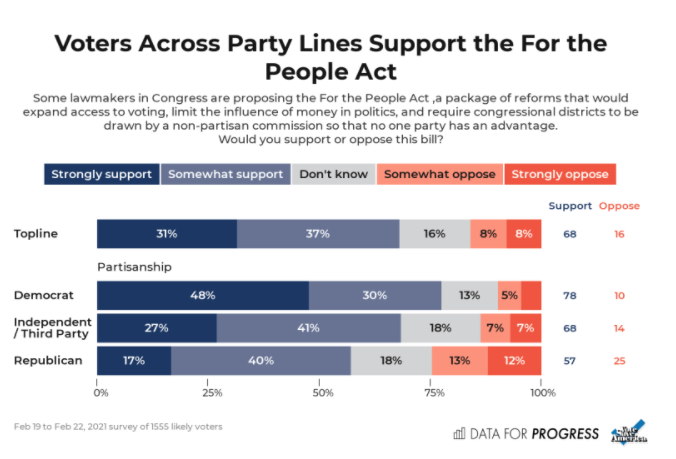 The American people want bold solutions to defend voting rights and combat the power of wealthy special interests in politics. A recent poll by Data for Progress found that 68% of American voters support the For the People Act, and the bill wins majority support from Democrats, Republicans, and Independents alike. A bill with this much support should not be stalled by Mitch McConnell’s filibuster.