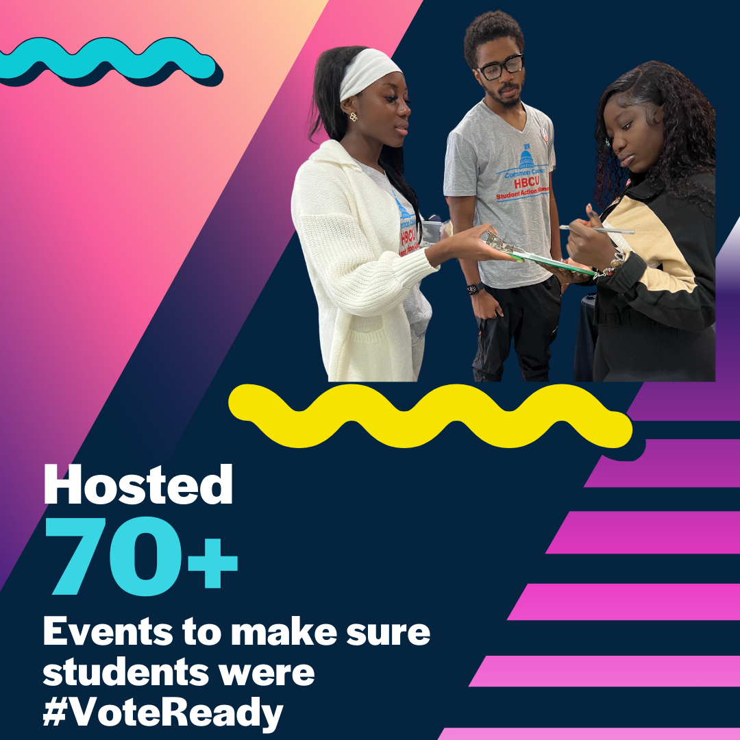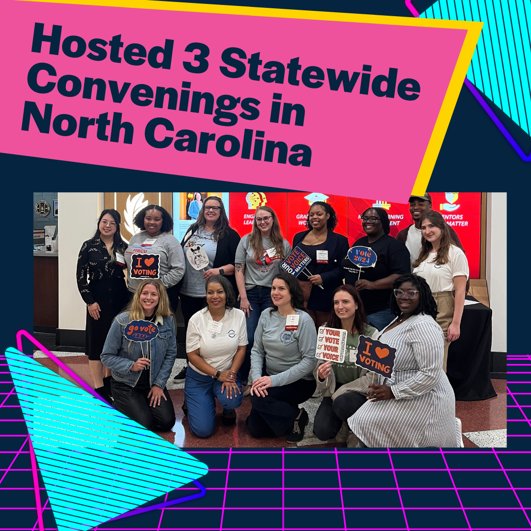 Sa North Carolina nag-host kami ng 3 statewide youth convening na nakatuon sa pagpapataas ng civic engagement sa mga campus ng North Carolina sa buong estado na may sinadyang pagtutok sa Historically Black Colleges and Universities. Ang ilan sa mga paksang tinalakay ay ang edukasyon ng botante, mga tool para sa adbokasiya, pag-aayos ng kampus, mga bagong batas sa pagboto, proteksyon sa halalan, digital na pag-aayos, mga repormang maka-demokrasya, at pagbibigay ng karapatan sa mga botante. malapit na 200 estudyante ang lumahok sa isa o higit pa sa aming mga pagpupulong.