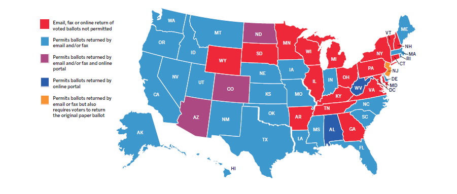 - Las agencias federales que apoyan a los estados a mejorar la seguridad de sus elecciones no han emitido ninguna advertencia sobre la devolución en línea de las papeletas votadas.