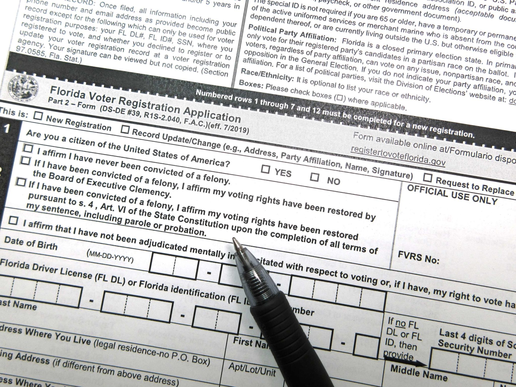 Common Cause Florida, el Comité de Abogados por los Derechos Civiles Bajo la Ley, Fair Elections Center, LatinoJustice, All Voting Is Local, League of Women Voters of Florida y Demos están planteando preguntas sobre la falta de reglamentación para el formulario DS DE 39 – Solicitud de Registro de Votante. Los nuevos formularios se promulgaron en julio como formularios impresos y rellenables y en el sistema de registro de votantes en línea – registertovoteflorida.gov en inglés y español.