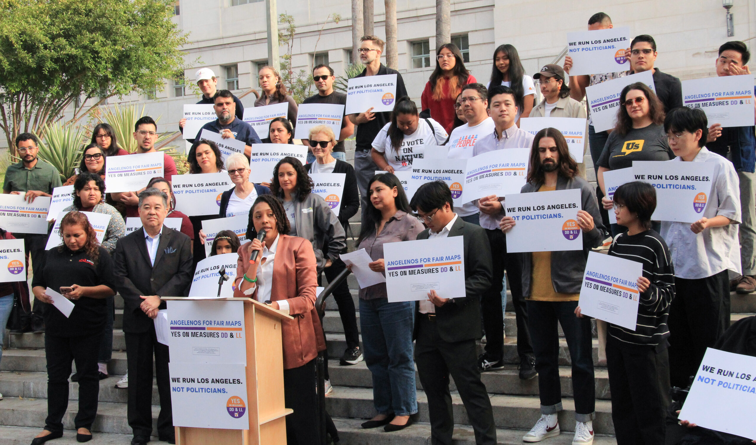 Au printemps 2024, Common Cause a réuni une coalition d’organisations communautaires impliquées dans le plaidoyer pour créer un IRC afin de créer un comité de campagne dédié à l’éducation des électeurs et à garantir que les mesures de vote de l’IRC soient adoptées. Les habitants de Los Angeles pour des cartes équitables Lancé en septembre 2024, le groupe a tenu une conférence de presse devant l'hôtel de ville de Los Angeles le 9 octobre 2024, soit le deuxième anniversaire de la fuite des enregistrements. California Common Cause a rédigé l'argumentaire et la réfutation du scrutin en faveur du LAUSD IRC et a été signataire de l'argumentaire du scrutin du City IRC.