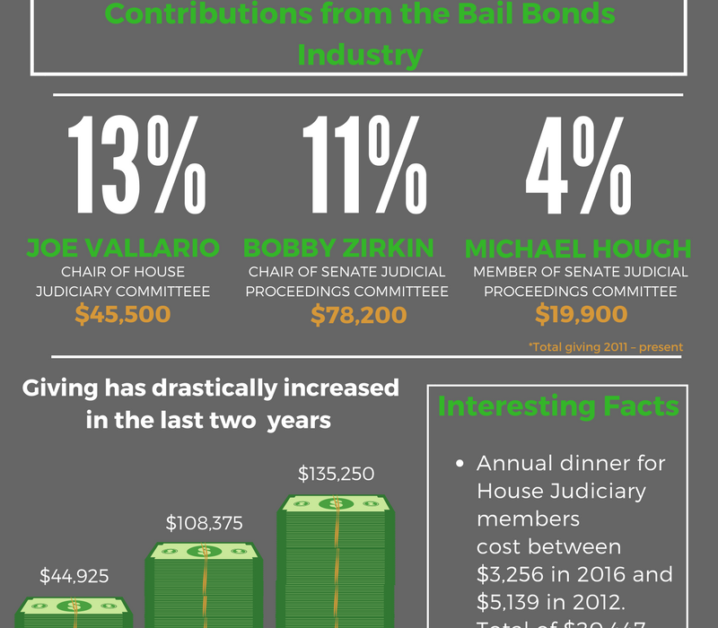 Ang Maryland ay isa sa mga nangungunang estado para sa mga donasyon ng kampanya ng industriya ng bail bond, na nasa likod lamang ng California at Florida, ayon sa data mula sa FollowtheMoney.org. Sa katunayan, kapag sinusuri ang mga donasyon sa mga indibidwal na kandidato, ang aming dalawang pinakamalaking tumatanggap ng mga donasyon ng bail bond, sina Sen. Bobby Zirkin at Del. Joseph Vallario, ay ang pangalawa at pangatlo sa pinakamataas na tatanggap sa US Total na pagbibigay ng industriya ng bail bond mula 2011 hanggang 2017 ay $288,550. Ang pagbibigay sa huling ikot ng halalan ay umabot sa $153,300. Ang pagbibigay sa kasalukuyang ikot ng halalan ay nasa tamang landas upang lubos na maabutan ang bilang na iyon, na umabot sa $135,250 sa unang dalawang taon lamang ng kasalukuyang ikot. Ang mga donasyon noong nakaraang taon lamang ay umabot ng napakalaking $87,100.