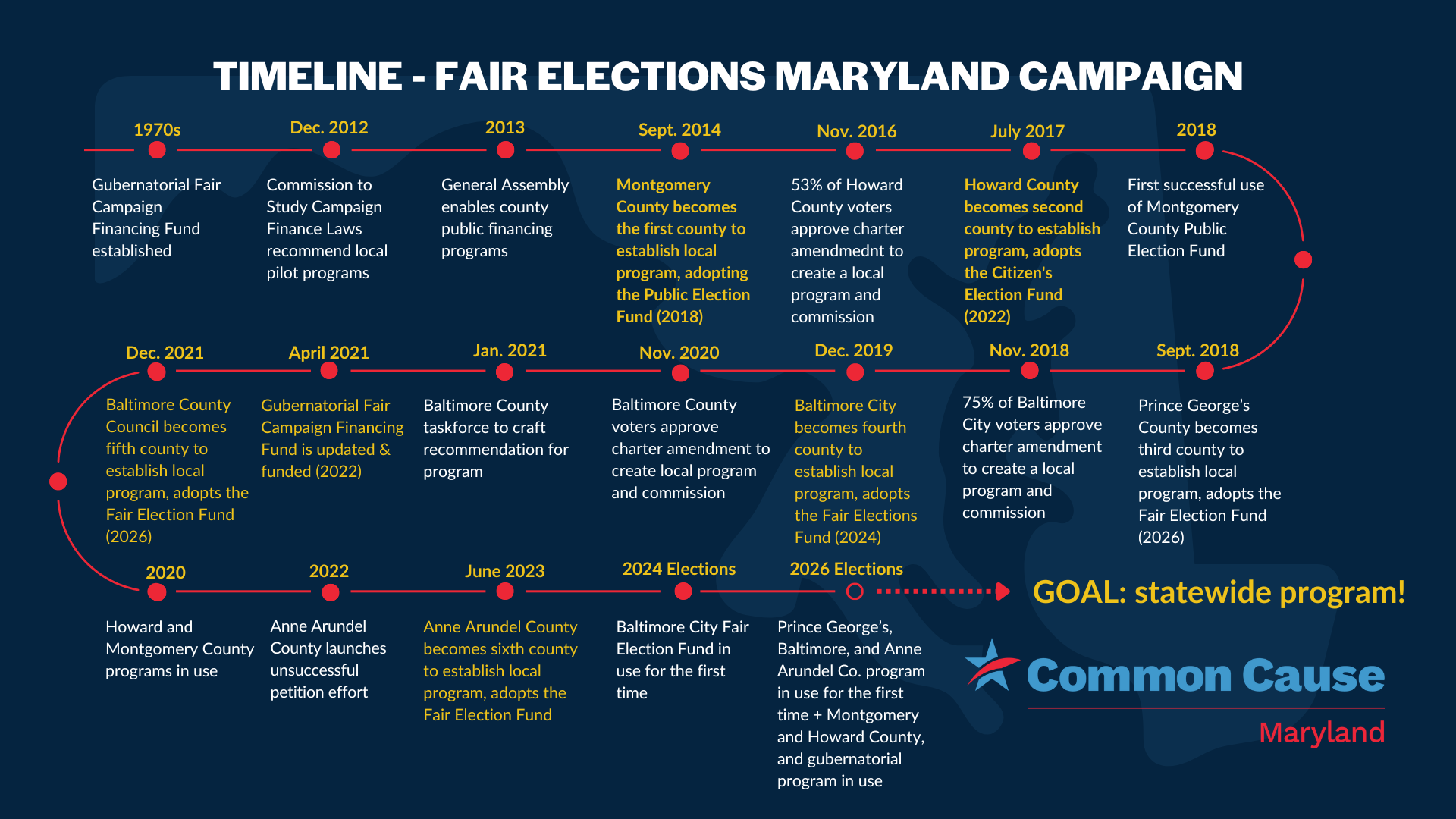 Common Cause Maryland là một phần của Fair Elections Maryland, một liên minh được thành lập để thiết lập các chương trình tài trợ chiến dịch của các nhà tài trợ nhỏ cho các cuộc bầu cử địa phương và tiểu bang tại Maryland. Để tìm hiểu thêm về các chương trình này và tham gia vào nỗ lực của chúng tôi, hãy truy cập fairelectionsmaryland.org.