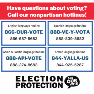 ¡La línea directa es tu mejor amiga! Llama para comunicar tus problemas o úsala para apoyar a los votantes. ¡Y no dudes en pedirle a otras personas que la utilicen también!