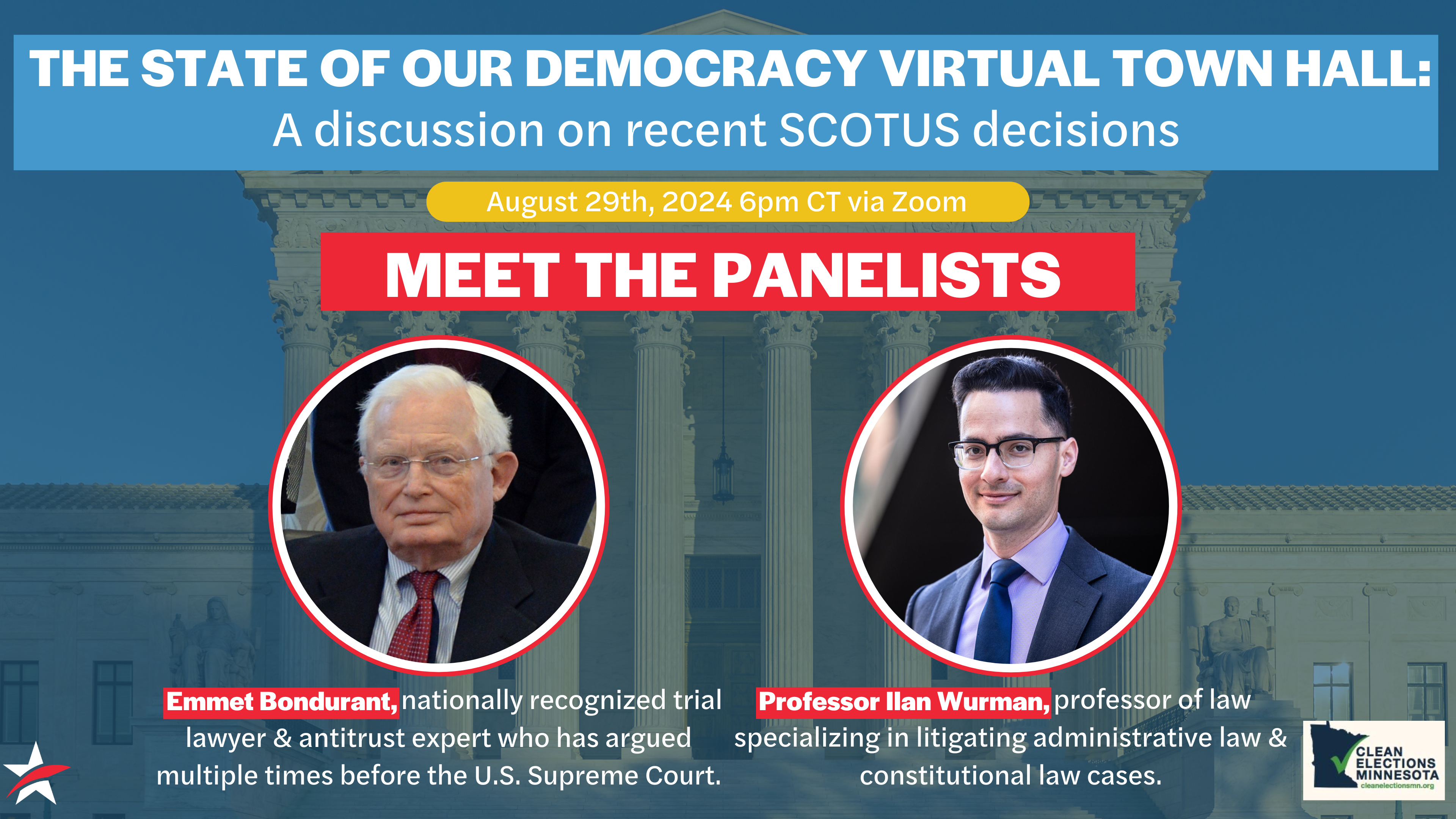 Chung Nguyên nhân Minnesota, hợp tác với Bầu cử sạch Minnesota, TôiS chủ nhàđang Một ảo thị trấn sảnh với chuyên gia pháp lý quốc gia và địa phương về tnhiệm kỳ gần đây nhất của Tòa án Tối cao Hoa Kỳ, và tiềm năng của nó các hiệu ứng về dân chủ.