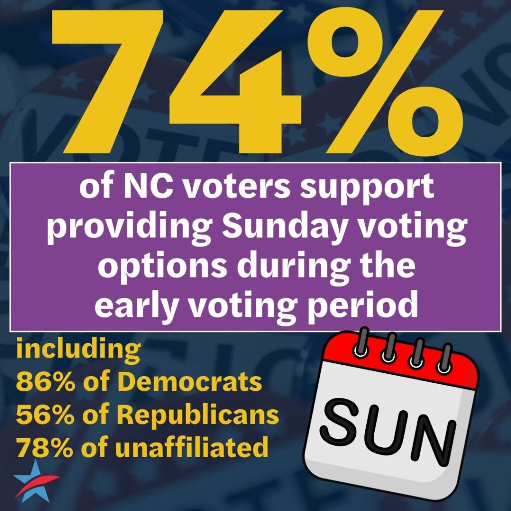 A strong majority – 74% of voters – support providing in-person voting on Sundays during the early voting period, as is currently allowed in North Carolina. Just 20% oppose Sunday voting.