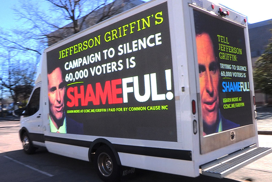 We’ve launched a statewide public service campaign to raise awareness of Griffin’s scheme and how it would hurt voters. Our mobile billboard has been traveling throughout the state to alert North Carolinians about Griffin’s shameful ploy to throw out 60,000 votes as he seeks to unjustly overturn the election.