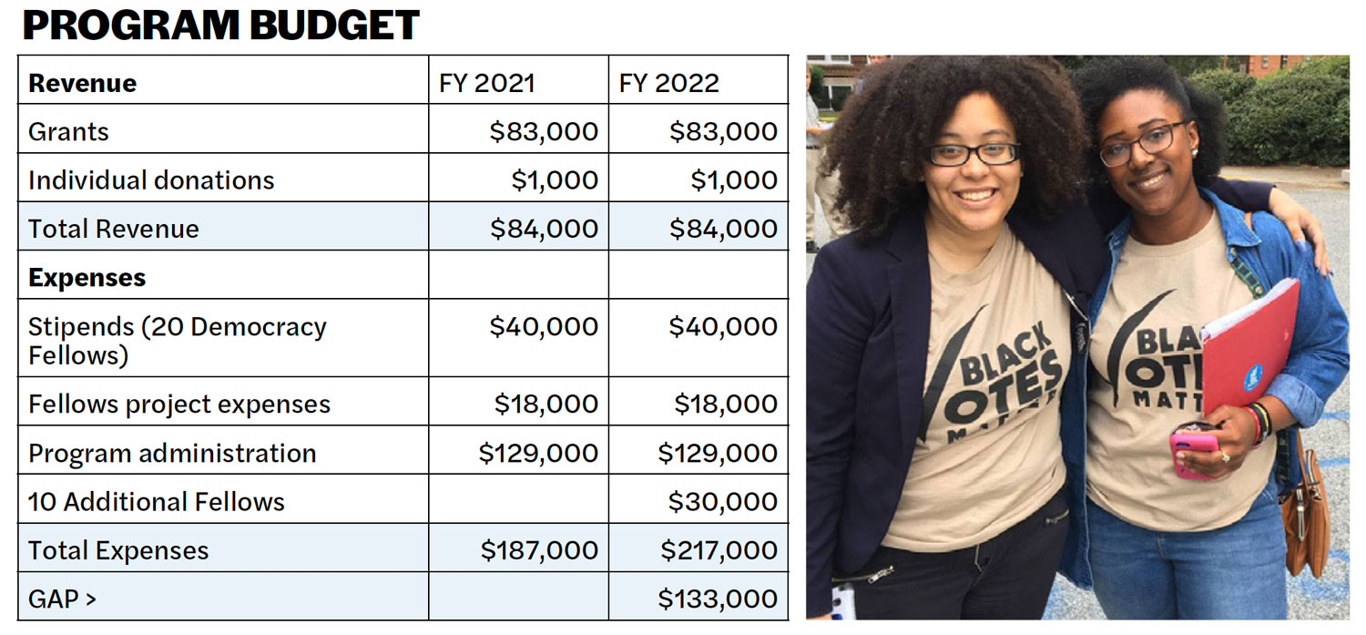 • $2500 – Partial Sponsorship of a Democracy Fellow (Stipend and project support for one semester)