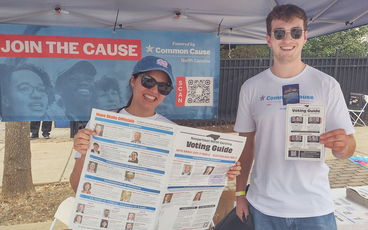 Các tình nguyện viên của Common Cause North Carolina giúp mọi người chuẩn bị cho cuộc bầu cử năm 2024 bằng cách chia sẻ hướng dẫn bỏ phiếu phi đảng phái tại CAROLINADAZE ở Raleigh
