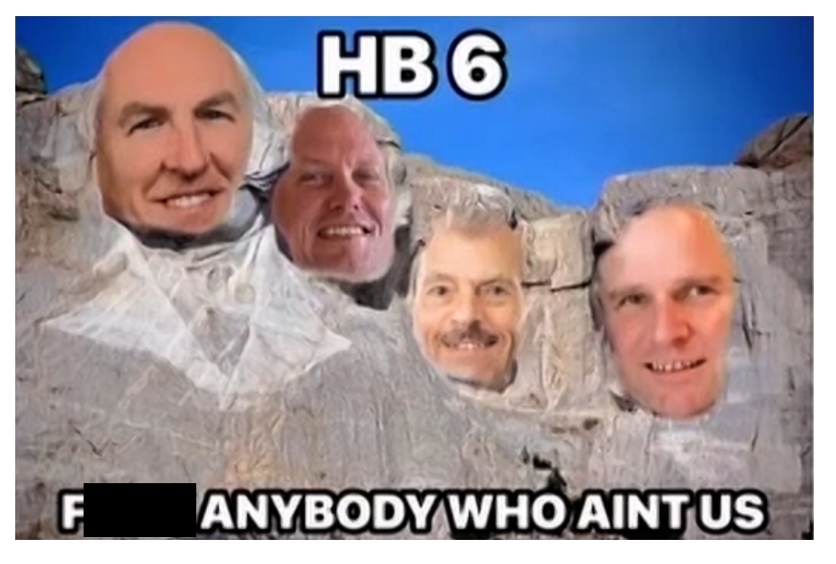 ラシュモア山の彫像に刻まれた顔は、左から順に、タイ・パイン、元ファーストエナジー副社長のマイク・ダウリング、元PUCO(オハイオ州公益事業委員会)委員長のサム・ランダッツォ、そしてボイチ・カンパニーズ社長のマット・エバンス。パイン氏は、2019年に下院法案6号が可決された後、2万5000ドルのボーナスを受け取った。.