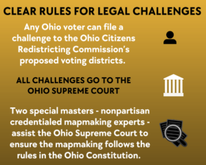 Iedere kiezer in Ohio kan binnen tien dagen na de publicatie van het eindrapport van de commissie bezwaar aantekenen tegen een herindelingsplan of de voorgestelde kiesdistricten bij het Hooggerechtshof van Ohio. Alleen de Commissie heeft de wettelijke bevoegdheid om op eventuele uitdagingen te reageren.