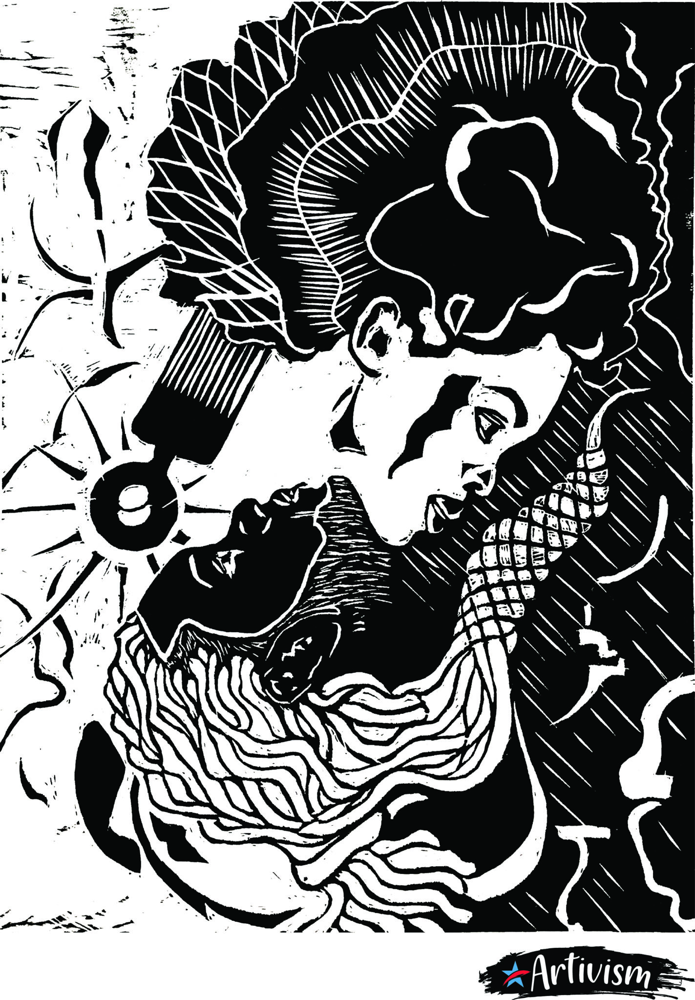 “Ik geloof dat de media volwassenen, en dan met name zwarte volwassenen, verkeerd afbeelden, waardoor er een kloof ontstaat in de visie van de volgende generatie op groei”, aldus Selorm Tettevi, 28, winnaar van de derde plaats in de Common Cause Artivism-wedstrijd van 2021. “Mijn kunstwerk representeert het begin (genesis), de wortels en de cultuur. Ik hoop over te brengen dat je jezelf terugvindt in een van de oude verhalen die de fundamenten/structuur van de wereld zoals we die vandaag kennen, hebben geconstrueerd.”