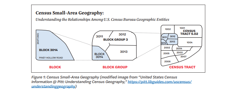 Ang Census Bureau ay tumutukoy sa tatlong antas ng heograpiya. Ang pinakamaliit na antas, a bloke ng sensus, ay isang maliit na heograpikal na lugar na napapaligiran ng mga nakikitang tampok (tulad ng mga kalsada, kalye, sapa at riles ng tren) at hindi nakikitang mga tampok (tulad ng mga linya ng ari-arian at mga hangganan para sa lungsod, township, distrito ng paaralan at county). Sa mga lungsod, ang mga bloke ng census ay maaaring isipin bilang isang maliit na bloke ng lungsod, na may mga kalye na nagbubuklod dito sa lahat ng panig. Sa mga suburban na lugar, ang mga bloke ng census ay maaaring magmukhang mas iregular at kumalat sa lugar, at nalilimitahan ng mga batis, kalsada at iba pang mga limitasyon sa heograpiya. Sa mas malalayong lugar, ang mga census block ay maaaring isang koleksyon ng daan-daang milya kuwadrado ng lupa. Ang isang artikulo sa loob ng isang pahayagan ay nagsisilbing isang kapaki-pakinabang na pagkakatulad upang isipin ang mga bloke ng census. Mula sa isang maliit hanggang sa malawak na frame, ang isang pahayagan ay may mga solong artikulo, mga seksyon para sa iba't ibang mga paksa at ang buong pahayagan mismo. Ang isang census block ay mas katulad ng isang artikulo, isang koleksyon ng mga salita na nakatali sa artikulong iyon mismo, at ang laki nito ay mula malaki hanggang maliit. Ang mga bloke ng census ay hindi binibigyang kahulugan ng kanilang laki ng populasyon. Maraming mga bloke ng census ay walang sinumang nakatira sa mga ito, ngunit sa pangkalahatan ay mula sa populasyong zero hanggang ilang daang tao bawat bloke ng census. Mayroong humigit-kumulang 8.2 milyong kabuuang bloke ng census sa US at Puerto Rico.