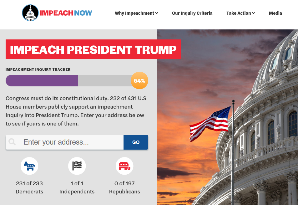 • Online — We launched a website ImpeachmentInquiry.org to track representatives’ positions on the impeachment inquiry and connect our members with their Congress member.