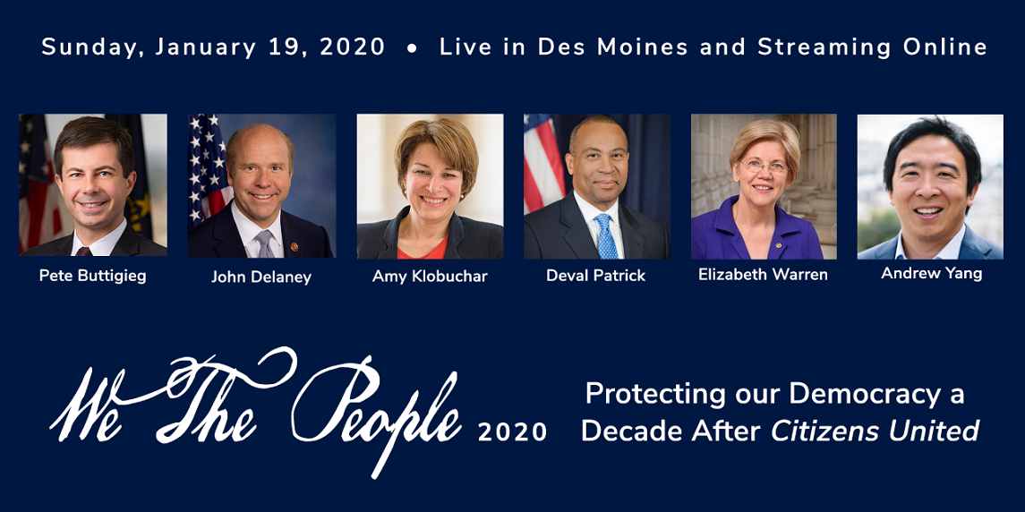 On this page we will livestream the “We The People” Protecting our Democracy a Decade After Citizens United presidential candidate forum featuring Senator Elizabeth Warren, Pete Buttigieg, Senator Amy Klobuchar, Deval Patrick, Andrew Yang and John Delaney. The livestream begins at 4:00 P.M. Eastern Time (3:00 P.M. Central Time) on Sunday, January 19, 2020.